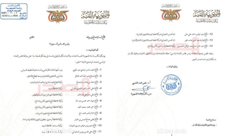 وفي الوثيقة الموجّهة من مدير مكتب رئاسة الجمهورية يحيى الشعيبي إلى رئيس مجلس الوزراء سالم بن بريك، طلب الشعيبي من رئاسة الوزراء مخاطبة وزارة الشؤون القانونية وحقوق الإنسان لاستكمال إجراءات إصدار قرارات التعيين التي تضمنت 14 إسماً في مناصب حكومية ما بين نائب وزير ورئيس هيئة ووكيل وزارة ووكيل محافظة.