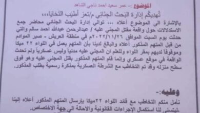 مذكرة رسمية تكشف تورط لواء عسكري بتهريب أحد المتهمين بجريمة قتل بمديرية صبر الموادم بمدينة تعز