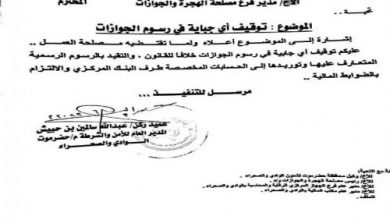 أصدر مدير أمن وادي وصحراء حضرموت العميد ركن عبدالله سالمين بن حبيش قراراً بتوقيف اي جباية في رسوم الجوازات. ووجه…