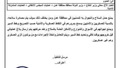 تعميم هام للقوات الجنوبية بشأن حمل السلاح والتجول به في العاصمة عدن