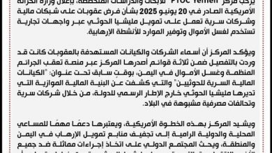يرحب مركز PTOC Yemen للأبحاث والدراسات المتخصصة، بإعلان وزارة الخزانة الأمريكية الصادر في 20 يونيو 2025 بشأن فرض عقوبات على…